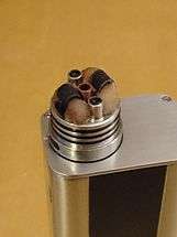 The power section may include additional options such as screen readout, support for a wide range of internal batteries, and compatibility with different types of atomizers.[12] Third-generation devices can have rebuildable atomizers with different wicking materials.[10][12] These rebuildables use handmade coils that can be installed in the atomizer to increase vapor production.[48] Hardware in this generation is sometimes modified to increase power or flavor.[51]