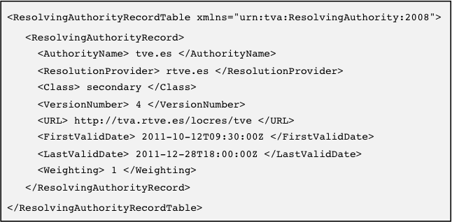 For example, in the record of the figure (expressed by means of a XML structure, according to the XML Schema defined in the TV-Anytime) there is an authority called “tve.es”, whose resolution service provider is the entity “rtve.es”, available on the URL "http://tva.rtve.es/locres/tve", which means there is resolution information in that URL.