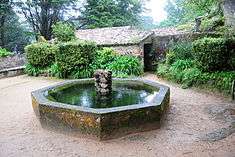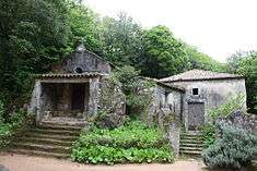 The site is located in the rural part of Sintra, along the northeastern flank of the Sintra Mountains, approximately 325 metres above sea level, in a location marked by dense vegetation and accentuated slopes, near King Ferdinand II's hunting grounds (Tapada D. Fernando II).[4] The convent, surrounded by a forest of oak and shrubbing species of trees, is walled into an area of rocks and exposed boulders. Along Sintra's old road connecting the village to Colares, and near the Palace of Monserrate, there is a road that heads towards this religious retreat, indicated by a 17th-century marker: "CAMINHO PARA O CONVENTO DE SANTA CRUZ DA SERRA, VULGO CAPUCHOS"; "1650". The access to the grounds is made by a portal (in the southeast corner of the site), or by the Terreiro das Cruzes (Terrace of Crosses), an irregularly-walled enclosure with a calvary located in the southwest corner and visitor's centre.[2][4] To the left of the cross in the Terrace of Crosses, is the principal entrance or Pórtico das Fragas (Portico of the Rocks), with an access-way comprising two large boulders, one of which is surmounted by a bell-gable.[2] From the walled enclosure, a small flight of stairs leads into the Terreiro do Campanário (Terrace of the Bellfry), a small irregular patio with cross, which leads to the buildings.[2][4] The southeast entrance, located a further distance from the visitors centre, comprises a gate and ancillary building, which leads directly to the much larger Terreiro do Fonte (Terrace of the Fountain) with the religious site.[2][4] So named because of the large octagonal water fountain, the Terrace is a principal square within the retreat, with bunk seating in rock around its edges. Legend suggests that King Sebastian would eat his meals around this fountain when he visited the convent.[2] The fountain, itself, shows vestiges of 17th century azulejo tile.[4]