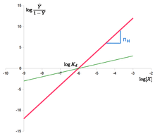 The "Hill plot" is obtained by plotting versus . In the case of the Hill equation, it is a line with slope and intercept (see Figure 2). This means that cooperativity is assumed to be fixed, i.e. it does not change with saturation. It also means that binding sites always exhibit the same affinity, and cooperativity does not arise from an affinity increasing with ligand concentration.