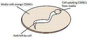 Because multiple colors can be imaged, CSSNCs’ ability to be used in cell labeling is of growing importance. However, it can be difficult to get CSSNCs across the cell membrane. This has been achieved via endocytosis (the most common method), direct microinjection, and electroporation, and once in the cell, they become concentrated in the nucleus and can stay there for extended periods of time. Once CSSNCs are inside cells, they remain even after cellular division and can be imaged in both mother and daughter cells. This particular technique was shown using Xenopus embryos. Another example of CSSNCs is seen in their tracking ability; when cells are gown on a 2D matrix embedded with CSSNCs, cells uptake the CSSNCs as they move, leaving a trail seen as the absence of CSSNCs. This means that the mobility of cells can be imaged, which is important since the metastatic potential of breast tissue cells has been shown to increase with mobility. Also, it has been shown that five different toxins can be detected using five different CSSNCs simultaneously.