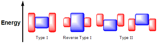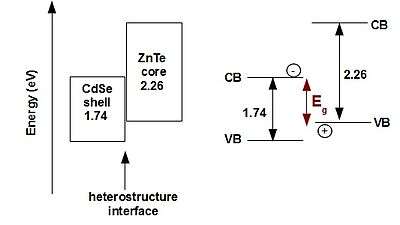 In the type II configuration, the valence and conduction band edge of the core are both lower or higher than the band edges of the shell. An example of a type II is shown in figure X, ZnTe(bandgap:2.26)/CdSe(bandgap:1.74). The lowest energy separation of the electron and the hole will occur when the hole is confined in the ZnTe core valence band and the electron is confined in the CdSe shell conduction band. The emission wavelength will be determined by the energy difference between these occupied states, as shown by the red arrow, which will be at a lower energy than either of the individual bandgaps.[14] The emission wavelength can be significantly red shifted compared to the unpassivated core.