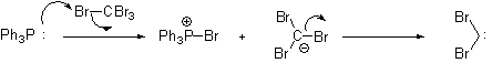 Triphenylphosphine then attacks the nascent carbene to form the reactive ylide. This ylide undergoes a Wittig Reaction when exposed to an aldehyde.