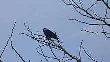 The nesting season starts early, with some birds incubating eggs by early April.[21] American crows build bulky stick nests, nearly always in trees but sometimes also in large bushes and, very rarely, on the ground. They will nest in a wide variety of trees, including large conifers, although oaks are most often used. Three to six eggs are laid and incubated for 18 days. The young are usually fledged by about 36 days after hatching. Predation primarily occurs at the nest site and eggs and nestlings are frequently eaten by snakes, raccoons, ravens and domestic cats. Adults are less frequently predated but face potential attack from great horned owls, red-tailed hawks, peregrine falcons and eagles. They may be attacked by predators such as coyotes or bobcats at carrion when incautious although this is even rarer.[17][22]