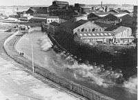 Sitting on the South Lancashire Coalfield, the town was built both physically and metaphorically on coal; the original motto in the borough council's coat of arms was "Ex Terra Lucem" ("From the Ground, Light")[40][41][42][43] and local collieries employed up to 5,000 men as late as the 1970s. During the boom years of the British coal industry (1913 was the peak year of production, with 1 million employed in UK mining industry) the St Helens division of the Lancashire and Cheshire Miners' Federation (the local miners' union) had the largest membership (10%) of that federation.[7]