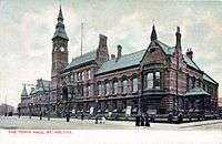 The original Town Hall was constructed in 1839 and described by Wilson in 1874 as "in the Italian style, with a Corinthian portico; and contains a lock-up, a news room, and a large hall for courts, concerts, balls, and public meetings".[26] It was not until 1852 that the Civil Parish of St Helens was instituted (noted in 1874 by Wilson as "more extensive than the town"[26]).