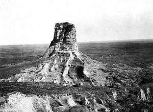 Hundreds of westward-bound emigrants mentioned Courthouse Rock (originally also McFarlan's Castle) in their travel logs and journals. The name "Courthouse" was first used in 1837.[3] In 1845, one traveler described the rock as "resembling the ruins of an old castle [which] rises abruptly from the plain....It is difficult to look upon it and not believe that art had something to do with its construction. The voyagers have called it the Courthouse; but it looks infinitely more like the Capitol."[4]