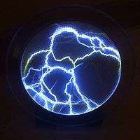 A crackle tube is a type of plasma lamp that is used most commonly in museums, night clubs, movie sets, and other applications where its appearance may be appealing for entertainment. Such a device consists of a double walled glass tube with a hollow center. The cavity between the inner and outer glass tubes is filled with thousands of small phosphor coated glass beads. A 5–14 kV transformer sends a very low power, high frequency electrostatic discharge into the bead filled cavity, producing filaments of light that simulate lightning. Crackle tubes get their name not because of the sound they produce but rather because of the appearance of their internal behavior. The "lightning" (filaments or streamers) is forced around and in between the phosphor-coated glass beads, due to the beads' dielectric nature. In so doing, the phosphor is excited by the electrical energy and fluoresces producing visible light. Like plasma globes, crackle tubes respond to touch; the filaments appear to be "attracted" toward the point of contact and usually become more luminous (brighter) as the electricity is grounded. The tubes are also filled with a noble gas like neon, argon, or xenon which acts as the electron transfer medium of the cavity. The gas is typically kept at only slightly above atmospheric pressure.