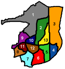 The borough remains part of the local two-tier arrangements, with services shared with West Sussex County Council. The authority is divided into 15 wards, each of which is represented by two or three local councillors, forming a total council of 37 members. Most wards are coterminous with the borough's neighbourhoods, but two neighbourhoods are divided: Broadfield into North and South wards, and Pound Hill into "Pound Hill North" and "Pound Hill South and Worth". The council is elected in thirds.[45]