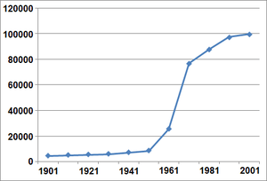 Expectations of the eventual population of the town were revised upwards several times. The 1949 master plan had allowed for 50,000 people, but this was amended to 55,000 in 1956 after the Development Corporation had successfully resisted pressure from the Minister for Town and Country Planning to accommodate 60,000. Nevertheless, plans dated 1961 anticipated growth to 70,000 by 1980, and by 1969 consideration was given to an eventual expansion of up to 120,000.[34]
