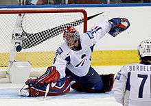 Huet made his next appearance for the Blackhawks during game three of the 2009 Western Conference Finals, where he was called to replace an injured Khabibulin.[2] He made six saves, and allowed the Blackhawks to collect an overtime win. With Khabibulin still recovering from a lower body injury, Joel Quenneville named Huet the team's starting goalie for the fourth game against Detroit.[3] Huet allowed five goals on 21 shots, and was temporarily replaced by Corey Crawford.[4] During the final game of the series, Huet stopped 44 shots en route to a 2–1 overtime loss.[5]
