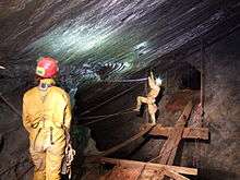 Croesor Quarry is connected to the nearby Rhosydd Quarry by a tunnel that was built to aid surveying and settle boundary disputes. Apart from Chamber 1 East, a huge chamber in which the roof has collapsed, most of the accessible mine is in reasonable condition.[29] Below the adit level, the mine is flooded and inaccessible.[27] In spite of a series of collapses, particularly in the Rhosydd Quarry, an underground journey from Croesor to Rhosydd is still possible and is considered to be a classic trip for mine explorers. It is known as the Croesor–Rhosydd Through Trip. Fixed ropes, home-made suspension bridges, zip wires, and inflatable boats have been installed which make it possible to complete the journey in comfort although not necessarily in safety.[29][30][31]