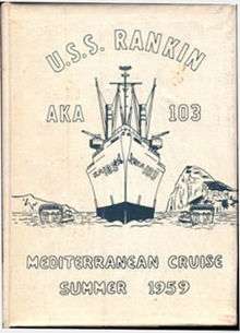 A cruise book is a yearbook-style publication often produced by ships of the United States Navy upon completion of a long deployment (typically six months or more). The books typically contain photos of all the people who were aboard during the cruise, usually grouped by their division or department. There are often candid photos as well, showing the people at work aboard the ship. Often there is a map or a description of the ship's travels during the cruise, and there are almost always pictures taken at the various ports of call.[1]