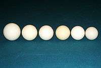 "Billiard balls" or "pool balls" is the name given to balls used in stage magic tricks, especially the classic "multiplying billiard balls". Though obviously derived from real billiard balls, today they are usually smaller, for easier manipulation and hiding, but not so small and light that they are difficult to juggle, as the magic and juggling disciplines have often overlapped since their successful combination by pioneers like Paul Vandy.