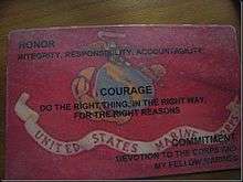 The Marine Corps Core Values of Honor, Courage, and Commitment have gained increased prominence in recent years.[4][5] As an emphasis on performing morally on and off duty, the concept of core values has been infiltrated into many aspects of Marine life, beginning in recruit training and continuing into combat.[6] This "warrior ethos" provides guidance to Marines in difficult ethical situations and acts as a reminder to provide good order and discipline.[7]