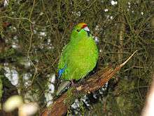 The yellow-crowned parakeet (Cyanoramphus auriceps) is a species of parakeet endemic to the islands of New Zealand. The species is found across the main three islands of New Zealand, North Island, South Island and Stewart Island/Rakiura, as well as on the subantarctic Auckland Islands. It has declined due to predation from introduced species such as stoats, although unlike the red-crowned parakeet, it has not been extirpated from the mainland of New Zealand. Its Māori name is kākāriki.