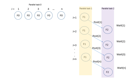 wait(j); //It waits till the F1 completes and produces the value z[j] to be used by F2