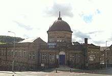 Originally situated in the Peel Street Baths (now the Co-operative supermarket in the Circus), the library was transferred to the new technical school building in 1895.[17] Today Darwen Library stands at the corner of Knott Street and School Street to the north of the Circus. It was commissioned by Andrew Carnegie, a Scottish migrant to the USA who made his fortune as a producer of iron and steel. He donated £8,000 in response to a speculative appeal for funds by the Library Committee. The opening took place on 27 May 1908 and was attended by Mayor Councillor G.P. Holde, Councillor Ralph Yates and Carnegie himself. The library has served the town ever since, with the original lecture hall being transformed into the Library Theatre in June 1971.[17]