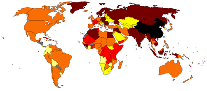 Countries of the world indicating decade diplomatic relations commenced with the PRC: 1949/1950s (dark red), 1960s (red), 1970s (orange), 1980s (beige) and 1990s/2000s (yellow). Countries not recognised by or not recognising the PRC are in grey. The PRC itself is in black.