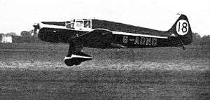 On 7 September 1935, it came in fourth in the King's Cup Race at Hatfield,[9] but on 11 July 1936, it could only finish sixth.[10] It did rather better on the Isle of Man, where on 6 June 1938 it came fourth in the Manx Air Derby.[3][11] On 27 May 1939, it won the race from Hatfield to the Isle of Man, and on 29 May 1939 it came fifth in the Manx Air Derby[3][12]