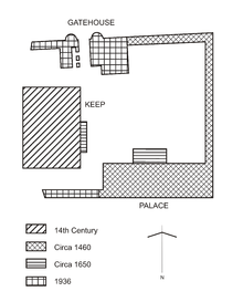 The present Gatehouse was entirely built in 1935–36. It was never present in the original castle. However, it is carefully copied from real sixteenth-century buildings, including details like the windows with half-wooden shutters and half-leaded glass. The overall design and decorative but usable gun loops are copied from the gatehouse built at Tolquhon Castle, Aberdeenshire built in the 1580s. The wooden walkway around the wall guarding the palace was added in the restoration.