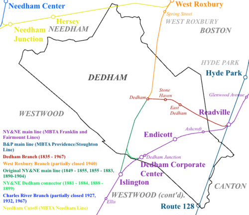 At various times, train stations have also been located at seven other sites in Dedham on several different lines and branches, plus several other stations located in adjacent parts of its neighbouring cities and towns.[2][1] On the Dedham Branch itself, there were also (from west to east) Stone Haven and East Dedham stations, which closed at the same time as Dedham (Center) station (April 21, 1967).