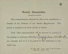 - ↑ Defence of the Realm (No. 2) Regulations, 1914, s. 4, at The London Gazette: (Supplement) no. 28887. pp. 6968–6969. 1 September 1914.