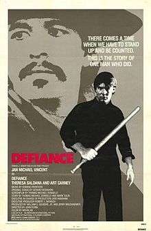 Defiance is a 1980 American film starring Jan-Michael Vincent, Art Carney, and Theresa Saldana.