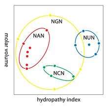 Degeneracy is the redundancy of the genetic code. This term was given by Bernfield and Nirenberg. The genetic code has redundancy but no ambiguity (see the codon tables below for the full correlation). For example, although codons GAA and GAG both specify glutamic acid (redundancy), neither of them specifies any other amino acid (no ambiguity). The codons encoding one amino acid may differ in any of their three positions. For example, the amino acid leucine is specified by YUR or CUN (UUA, UUG, CUU, CUC, CUA, or CUG) codons (difference in the first or third position indicated using IUPAC notation), while the amino acid serine is specified by UCN or AGY (UCA, UCG, UCC, UCU, AGU, or AGC) codons (difference in the first, second, or third position).[27]:102–117 :521–522 A practical consequence of redundancy is that errors in the third position of the triplet codon cause only a silent mutation or an error that would not affect the protein because the hydrophilicity or hydrophobicity is maintained by equivalent substitution of amino acids; for example, a codon of NUN (where N = any nucleotide) tends to code for hydrophobic amino acids. NCN yields amino acid residues that are small in size and moderate in hydropathy; NAN encodes average size hydrophilic residues. The genetic code is so well-structured for hydropathy that a mathematical analysis (Singular Value Decomposition) of 12 variables (4 nucleotides x 3 positions) yields a remarkable correlation (C = 0.95) for predicting the hydropathy of the encoded amino acid directly from the triplet nucleotide sequence, without translation.[28][29] Note in the table, below, eight amino acids are not affected at all by mutations at the third position of the codon, whereas in the figure above, a mutation at the second position is likely to cause a radical change in the physicochemical properties of the encoded amino acid.