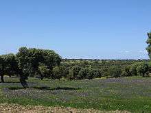 Dehesa is a multifunctional agro-sylvo-pastoral system (a type of agroforestry) and cultural landscape of southern and central Spain and southern Portugal, where it is known as montado.[1] Dehesas may be private or communal property (usually belonging to the municipality). Used primarily for grazing, they produce a variety of products including non-timber forest products such as wild game, mushrooms, honey, cork, and firewood. It is also used as natural habitat for the Spanish fighting bull and the Iberian pig. The tree component is oaks, usually holm (Quercus ilex) and cork (Quercus suber). Other oaks, including melojo (Quercus pyrenaica) and quejigo (Quercus faginea), may be used to form dehesa, the species depending on geographical location and elevation. Dehesa is an anthropogenic system that provides not only a variety of foods, but also wildlife habitat for endangered species such as the Iberian lynx and the Spanish imperial eagle.[2]