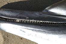 Short-beaked common dolphins can live in aggregations of hundreds or even thousands of dolphins.[5] They sometimes associate with other dolphin species, such as pilot whales.[5] They have also been observed bow riding on baleen whales, and they also bow ride on boats.[5] It is a fast swimmer (over 60 km/h), and breaching behavior and aerial acrobatics are common with this species.[6] They are very social animals and engage in most necessary activities such as traveling, eating, and breathing together.[4] They usually associate in groups that can consist of 1000s to 100,000s of individuals.[11] When some individuals are sick, others in the group assist them by using their fins to help keep them afloat so they survive.[4]