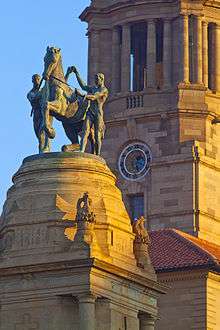 The memorial, which was designed by Sir Herbert Baker, with sculpture by Alfred Turner, consists of a flint and stone screen either side of an archway, with a shelter at each end of the screen.[1] On top of the arch is Turner's bronze statue of two men and a war horse. The two male figures, symbolising Castor and Pollux, represent the two white races of South Africa (British and Afrikaans).[4] The main inscriptions are in both English and Afrikaans. Other inscriptions include the location of the South African campaigns (France, Flanders, West Africa, Central Africa, East Africa, Egypt, Palestine, the Sea).[1] On the archway are the following shorter inscriptions, again in English and Afrikaans: