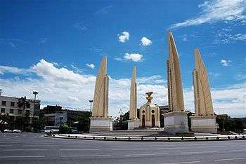 The Democracy Monument (Thai: อนุสาวรีย์ประชาธิปไตย Anusawari Prachathipatai) is a public monument in the centre of Bangkok, capital of Thailand. It occupies a traffic circle on the wide east-west Ratchadamnoen Klang Road, at the intersection of Dinso Road. The monument is roughly halfway between Sanam Luang, the former royal cremation ground in front of Wat Phra Kaew, and the temple of the Golden Mount (Phu Kao Thong).