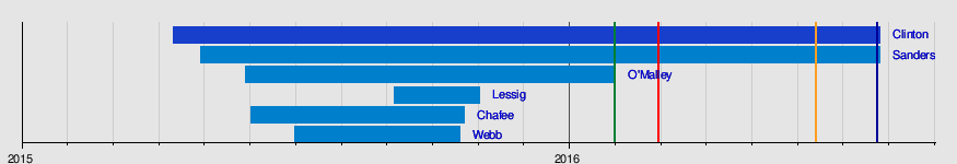 A total of six major candidates entered the race starting April 12, 2015, when former Secretary of State and New York Senator Hillary Clinton formally announced her second bid for the presidency. She was followed by Vermont Senator Bernie Sanders, former Governor of Maryland Martin O'Malley, former Governor of Rhode Island Lincoln Chafee, former Virginia Senator Jim Webb and Harvard Law Professor Lawrence Lessig. There was some speculation that incumbent Vice President Joe Biden would also enter the race, but he chose not to run. A draft movement was started to encourage Massachusetts Senator Elizabeth Warren to seek the presidency, but Warren declined to run. Prior to the Iowa caucuses on February 1, 2016, Webb and Chafee both withdrew after consistently polling below 2%.[2] Lessig withdrew after the rules of a debate were changed such that he would no longer qualify to participate.[3]