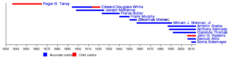 The first Catholic justice, Roger B. Taney, was appointed chief justice in 1836 by Andrew Jackson. The second, Edward Douglass White, was appointed as an associate justice in 1894, but also went on to become chief justice. Joseph McKenna was appointed in 1898, placing two Catholics on the Court until White's death in 1921. This period marked the beginning of an inconsistently observed "tradition" of having a "Catholic seat" on the court.[71]