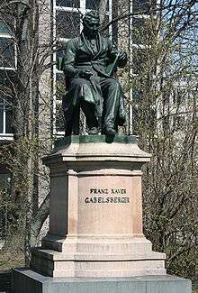 Memorial for Franz Xaver Gabelsberger is a monument located in Maxvorstadt, Munich, Bavaria, Germany. The monument is a bronze sculpture by the German sculptor Syrius Eberle. It was dedicated shortly after the hundredth anniversary of the birth of Franz Xaver Gabelsberger (1789-1849), the inventor of a cursive shorthand system. Casting was by Ferdinand von Miller.