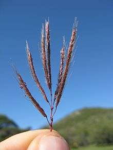 This species is quite variable.[3][4] In general, it is a perennial grass often with stolons. The stems spread outwards, then grow erect at the ends. A stem may be a meter long and reach about 60 centimeters in erect height.[5] Each node on the stem is encircled with a ring of hairs.[2] The rough-haired leaf blades are up to 30 centimeters long.[5] The inflorescence is an array of purplish or green branches each up to 7 centimeters long. There are generally 2 to 9 branches, but sometimes up to 15.[2] The spikelet may be well over 2 centimeters long, including its long awn. The awn is twisted and has two bends in it.[5] The root system goes no deeper than one meter.[2][6]