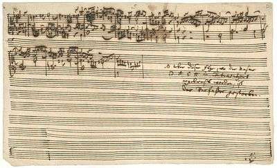 A handwritten manuscript of the piece known as the Unfinished Fugue is among the three bundled with the autograph manuscript P200. It breaks off abruptly in the middle of its third section, with an only partially written measure 239. This autograph carries a note in the handwriting of Carl Philipp Emanuel Bach, stating "Über dieser Fuge, wo der Name B A C H im Contrasubject angebracht worden, ist der Verfasser gestorben." ("At the point where the composer introduces the name BACH [for which the English notation would be B♭–A–C–B♮] in the countersubject to this fugue, the composer died.") This account is disputed by modern scholars, as the manuscript is clearly written in Bach's own hand, and thus dates to a time before his deteriorating health and vision would have prevented his ability to write, probably 1748–1749.[9]