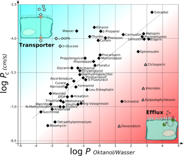 Drug permeability in brain capillaries (y-axis) as a function of partition coefficient (x-axis).[28]