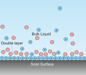 Schematic of double layer in a liquid at contact with a negatively-charged solid. Depending on the nature of the solids, there may be another double layer (unmarked on the drawing) inside the solid.