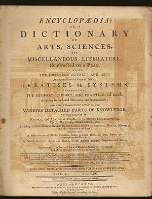 Dobson's Encyclopædia was the first encyclopedia issued in the newly independent United States of America, published by Thomas Dobson from 1789–1798.[1] Encyclopædia was the full title of the work, with Dobson's name at the bottom of the title page (see illustration).