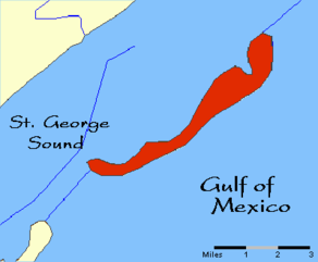 The island and its two neighbors were discovered by the French in 1536 and named the Dog Islands, because 1) wild dogs were found on them; 2) the islands resemble a crouched dog, or 3) the early ships put their common sailors - known as dogs - on the islands before docking on the mainland so they could not jump ship. Later, the two neighbors were renamed: St. Vincent, which is a Federal wildlife refuge, and St. George, which has a causeway and an airport (FA43), has developed into a seaside vacation community with shops and beach rentals.
