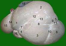 Sheep have good hearing, and are sensitive to noise when being handled.[13] Sheep have horizontal slit-shaped pupils, with excellent peripheral vision; with visual fields of about 270° to 320°, sheep can see behind themselves without turning their heads.[6][14] Many breeds have only short hair on the face, and some have facial wool (if any) confined to the poll and or the area of the mandibular angle; the wide angles of peripheral vision apply to these breeds. A few breeds tend to have considerable wool on the face; for some individuals of these breeds, peripheral vision may be greatly reduced by "wool blindness", unless recently shorn about the face.[15] Sheep have poor depth perception; shadows and dips in the ground may cause sheep to baulk. In general, sheep have a tendency to move out of the dark and into well-lit areas,[16] and prefer to move uphill when disturbed. Sheep also have an excellent sense of smell, and, like all species of their genus, have scent glands just in front of the eyes, and interdigitally on the feet. The purpose of these glands is uncertain,[17] but those on the face may be used in breeding behaviors.[7] The foot glands might also be related to reproduction,[7] but alternative reasons, such as secretion of a waste product or a scent marker to help lost sheep find their flock, have also been proposed.[17]