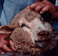Common forms of preventive medication for sheep are vaccinations and treatments for parasites. Both external and internal parasites are the most prevalent malady in sheep, and are either fatal, or reduce the productivity of flocks.[7] Worms are the most common internal parasites. They are ingested during grazing, incubate within the sheep, and are expelled through the digestive system (beginning the cycle again). Oral anti-parasitic medicines, known as drenches, are given to a flock to treat worms, sometimes after worm eggs in the feces has been counted to assess infestation levels. Afterwards, sheep may be moved to a new pasture to avoid ingesting the same parasites.[16] External sheep parasites include: lice (for different parts of the body), sheep keds, nose bots, sheep itch mites, and maggots. Keds are blood-sucking parasites that cause general malnutrition and decreased productivity, but are not fatal. Maggots are those of the bot fly and the blow-fly. Fly maggots cause the extremely destructive condition of flystrike. Flies lay their eggs in wounds or wet, manure-soiled wool; when the maggots hatch they burrow into a sheep's flesh, eventually causing death if untreated. In addition to other treatments, crutching (shearing wool from a sheep's rump) is a common preventive method. Some countries allow mulesing, a practice that involves stripping away the skin on the rump to prevent fly-strike, normally performed when the sheep is a lamb.[101][102] Nose bots are fly larvae that inhabit a sheep's sinuses, causing breathing difficulties and discomfort. Common signs are a discharge from the nasal passage, sneezing, and frantic movement such as head shaking. External parasites may be controlled through the use of backliners, sprays or immersive sheep dips.[7]