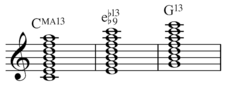 A thirteenth chord is the stacking of six (major or minor) thirds, the last being above the 11th of an eleventh chord.[1] Thus a thirteenth chord is a tertian (built from thirds) chord containing the interval of a thirteenth, and is an extended chord if it includes the ninth and/or the eleventh. "The jazzy thirteenth is a very versatile chord and is used in many genres."[2] Since 13th chords tend to become unclear or confused with other chords when inverted they are generally found in root position.[3] For example, depending on voicing, a major triad with an added major sixth is usually called a sixth chord