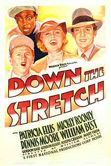 Down the Stretch is a 1936 American drama film directed by William Clemens and written by William Jacobs. The film stars Patricia Ellis, Mickey Rooney, Dennis Moore, Willie Best, Gordon Hart and Wild Bill Elliott. The film was released by Warner Bros. on September 18, 1936.[1][2]