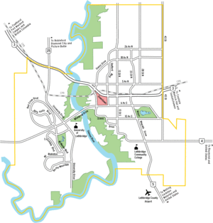Strictly speaking, the downtown is defined by the Oldman River valley on the west, the Crowsnest Highway and the CPR rail line on the north, Stafford Drive (9 Street) on the east and 6 Avenue on the south. It is not very large and contains very little in neighbourhood structure. It is, home to Chinatown, a two block area on 2 Avenue, west of Galt Gardens.