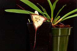 The orchid genus Dracula, abbreviated as Drac in horticultural trade, consists of 118 species native to Mexico, Central America, Colombia, Ecuador and Peru.[1] The name Dracula literally means "little dragon", an allusion to the mythical Count Dracula, a lead character in numerous vampire novels and films.[2][3] The name was applied to the orchid because of the blood-red color of several of the species, the strange aspect of the long spurs of the sepals.[4] The plants were once included in the genus Masdevallia, but became a separate genus in 1978. This genus has been placed in the subtribe Pleurothallidinae.