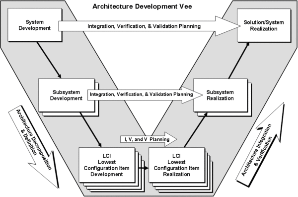 For simplicity of illustration, only one entity vee is shown intersecting the architecture vee at each decomposition level. Note that the design-to sequence is top down, starting at the system level and proceeding consistent with decomposition to the lowest configuration item level (LCI). This sequence ensures that there is proper top down requirements flowdown and traceability.