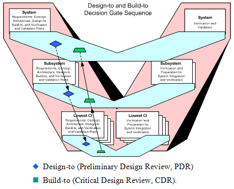At each elaboration, there is a direct correlation between activities on the left and right legs of the Entity Vee. Again this is deliberate. The method of verification to be used on the right Vee leg must be defined as requirements are developed on the left, otherwise requirements might be created that could not be verified. For example "user friendly" is a valid requirement, but it is unverifiable. Instead, a requirement that a computer screen display have "no more than five lines of 14-point text" defines one user's view of "user friendly" in measurable terms. Verification plans should be baselined to ensure verification requirements and methods are known and planned for at the design-to decision gate, commonly called Preliminary Design Review (PDR). Draft verification procedures based on the verification requirements, verification plan, and proposed entity design should be available at the build-to and code-to decision gate, commonly called critical design review (CDR). This reduces the chances that verification as specified cannot in fact be performed.